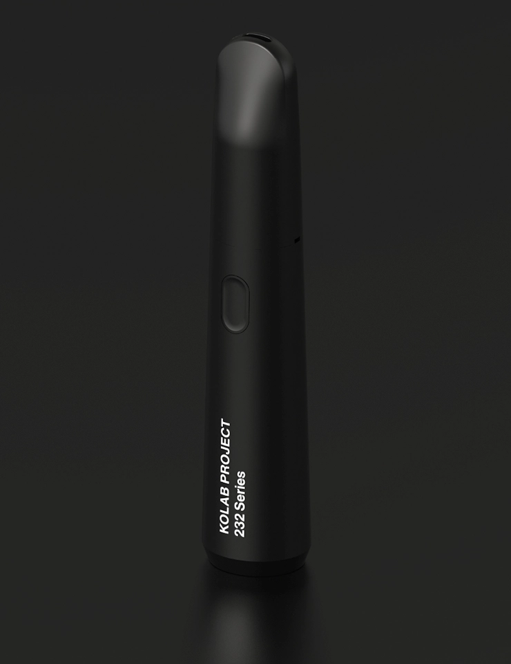 Utilizing 14th Round’s stock Gripstone Single Chamber All-in-One industrial design, our palm all-in-one for Kolab Project is as stealth in form and in-hand as it is in expressing the Kolab brand with color treatments and materiality. Subtle detailing with brand-decorated internal shrouding is applied to the user's eyes from unsightly electrical components while providing a difficult to duplicate anti-counterfeit touch.